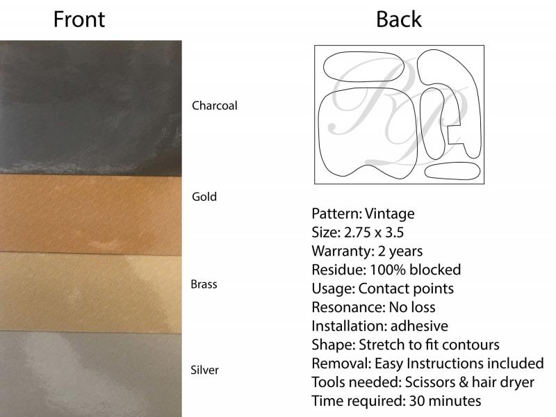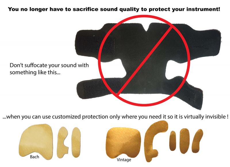 This is a new patented product for Professionals who collect and play fine accoustic musical instruments, but want to protect the finish without harming the appearance or degrading the sound. The special material is a patented heat activated adhesive backed metallic vinyl and it can be used on all brass, woodwind and string instruments.