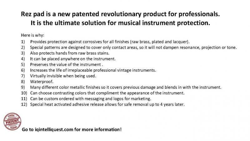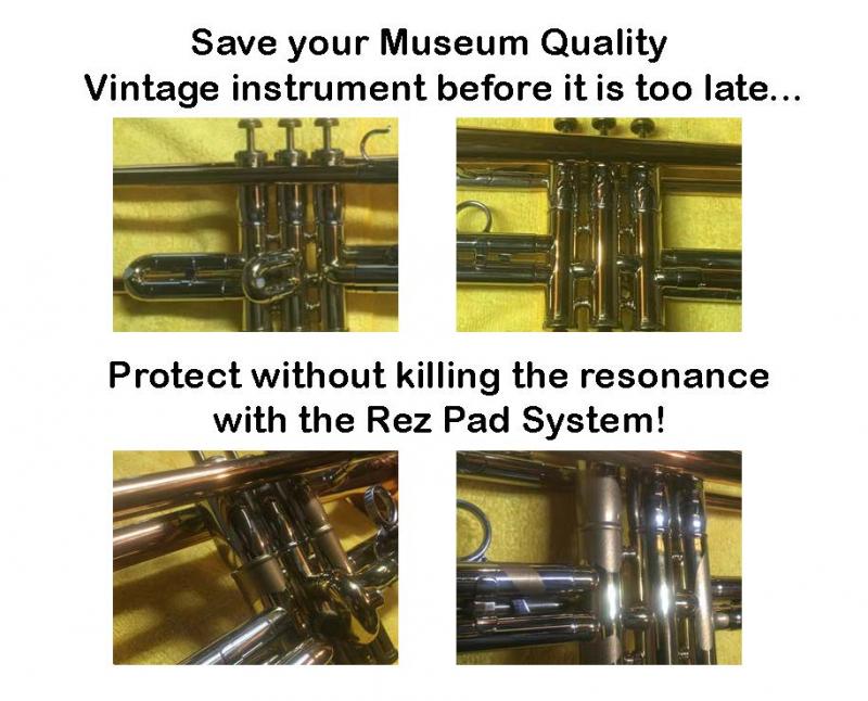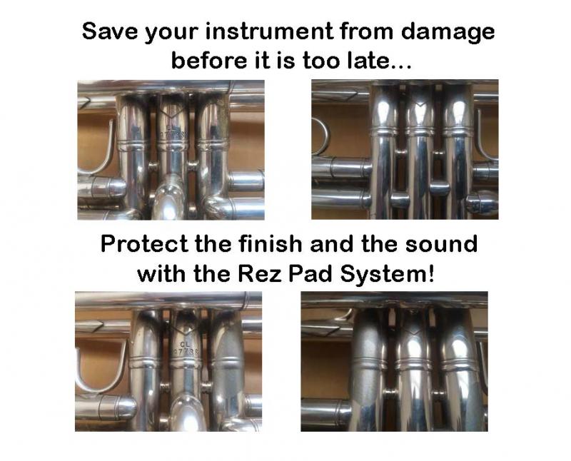That is why I invented the Rez Pad System. There is nothing out there like it on the market today! Coming soon will be a full line of products for all wind and string instruments on Ebay. For now, here is the trumpet solution, available in 5 metallic filagree colors to blend in and compliment. All brass instruments will be next!!